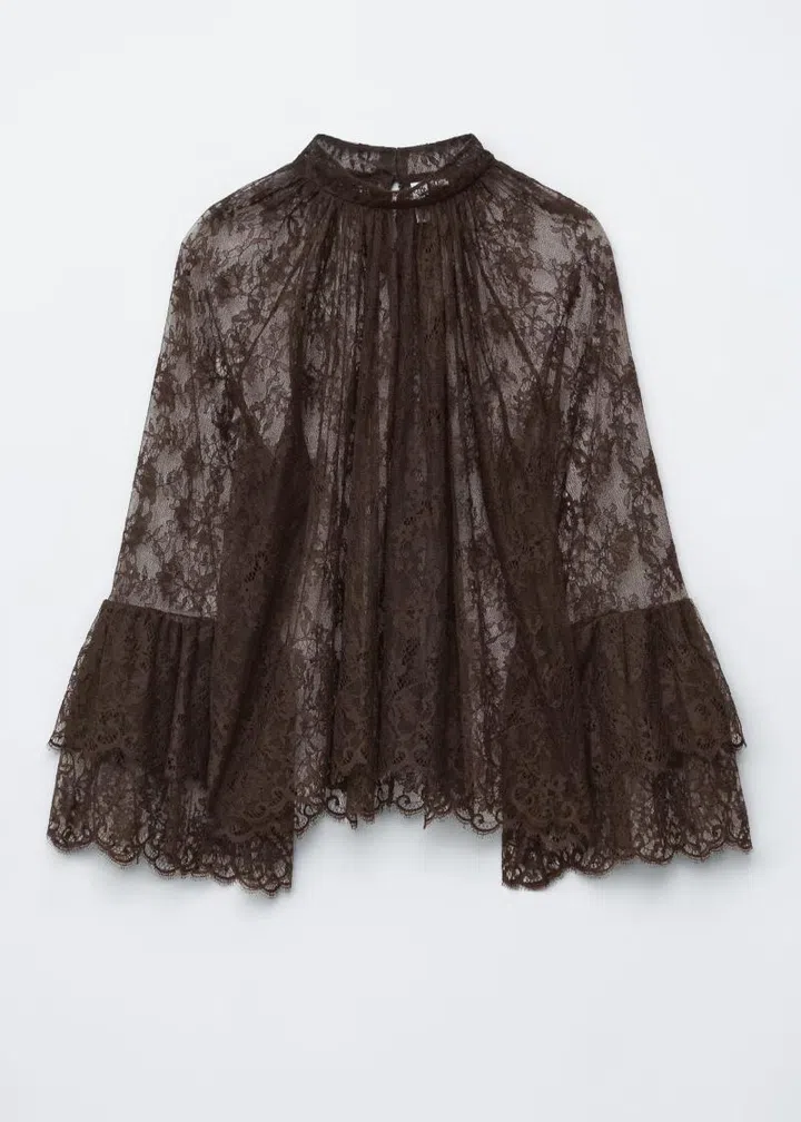 Softly structured and slightly sheer, this cocoa-toned blouse gives the lace trend a grounded, grown-up feel. The flounce detailing at the yoke adds movement, while the romantic high collar means you can skip the jewellery.